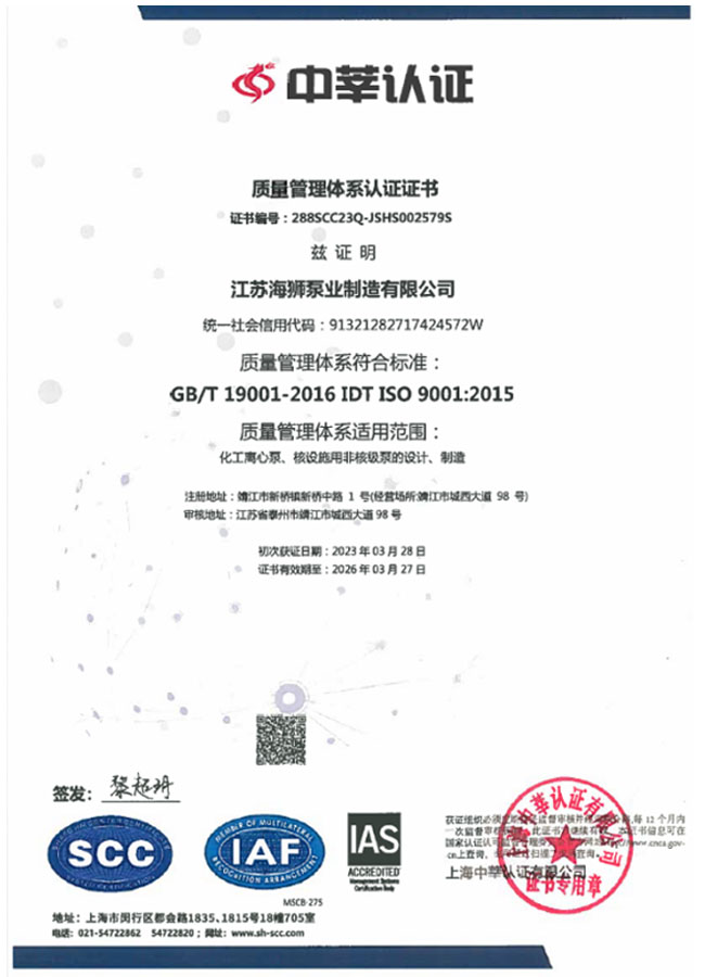 江(jiāng)蘇海(hǎi)獅泵業製造有限公司成立於(yú)1977年,由上海水(shuǐ)泵廠石油化工泵分廠、江蘇新亞化工機械(xiè)總廠(chǎng)聯合組(zǔ)建而來,是從事立、臥式、單、雙(shuāng)吸離心泵、BB係列及各種結(jié)構型式的多級泵等石油化工泵、核級泵專(zhuān)業製造的中型企業,是(shì)中(zhōng)石化物資(zī)資源市場成員廠、中國石油天(tiān)然氣集團(tuán)公司煉化備(bèi)品配件一級網絡成員單位,ISO9001質量體係認證(zhèng)企(qǐ)業,民(mín)用核安全設備設計和(hé)製造許可企業。公司集機械製造、冷熱加工、熔模鑄造、科研生產於一體(tǐ)。榮獲“江蘇省明星企業”、“部(bù)級先進企(qǐ)業”、“江蘇省星火技(jì)術(shù)密集區重點企業”、“江蘇省特級(jí)AAA(資信等級)”、“泰州市重合同、守信用企(qǐ)業”、“江(jiāng)蘇省(shěng)著名(míng)商標”等榮譽稱(chēng)號。
